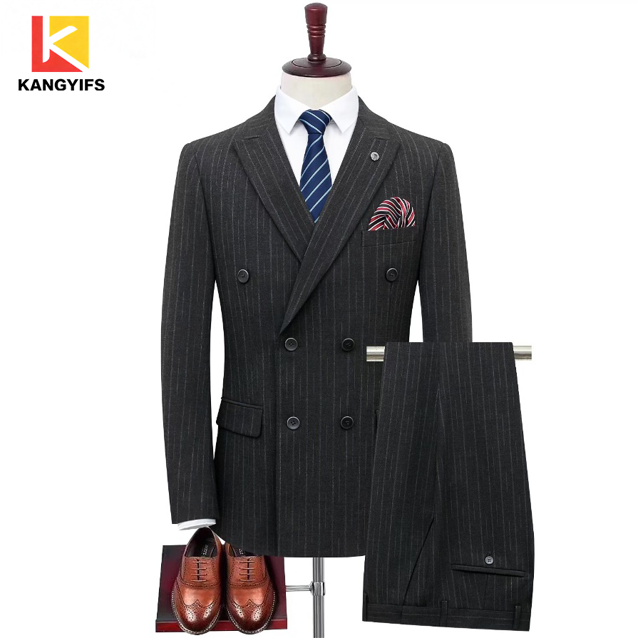 Σετ επαγγελματικό κοστούμι KANGYIFS σκούρο γκρι ριγέ διπλό στήθος για άνδρες, ένα επίσημο ένδυμα υψηλής ποιότητας που ερμηνεύει το στυλ των επιχειρηματικών ελίτ